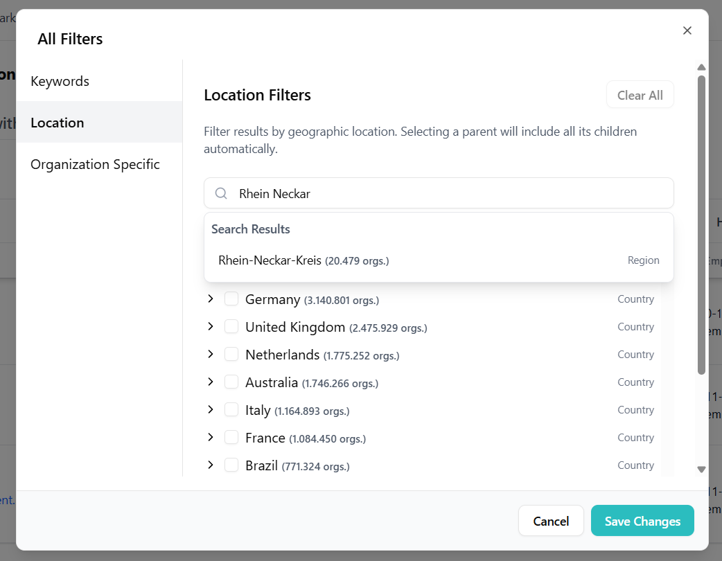 This enables targeted exploration in specific territories — perfect for regional strategy, compliance research, or cluster mapping and industrial network activity.
